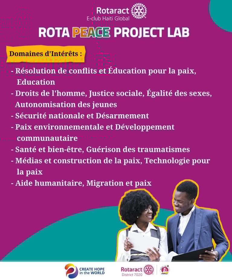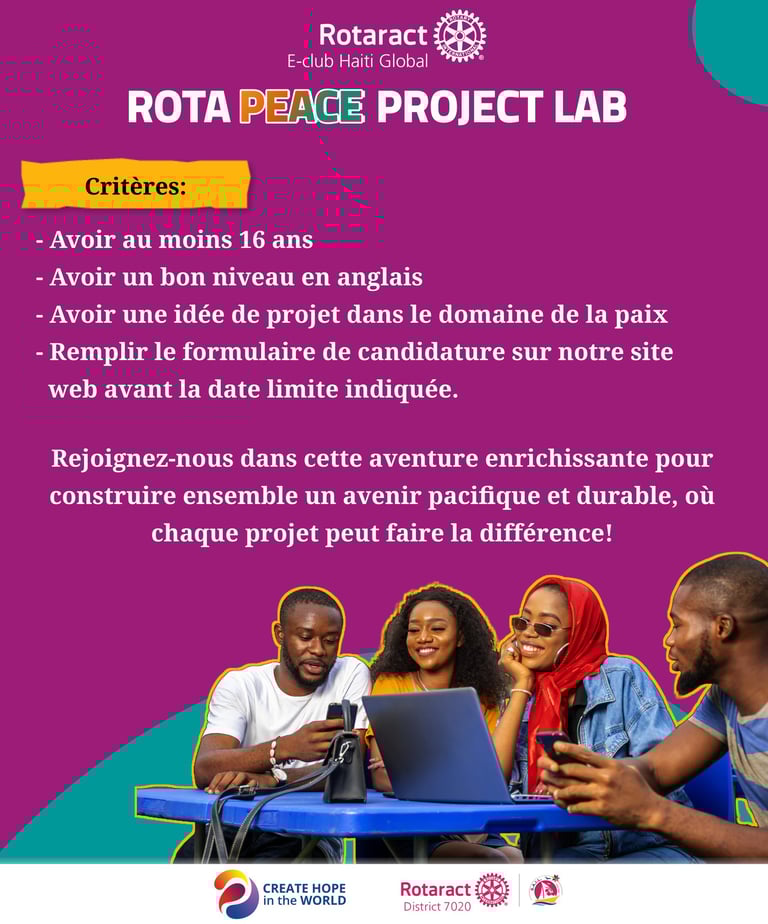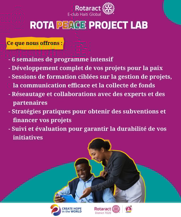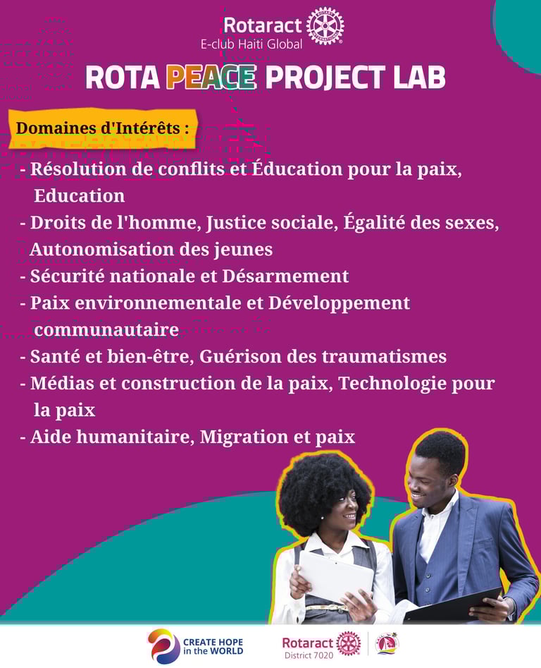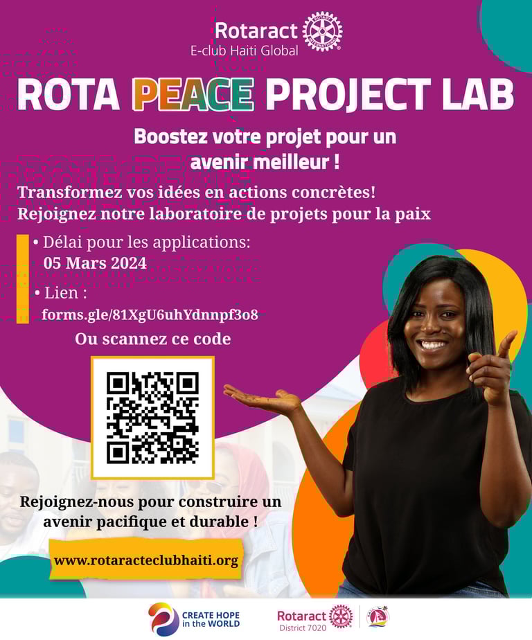 Rotaract E-club Haiti Global is delighted to announce the launch of the "Rota Peace Project Lab", an exciting initiative designed to support and empower individuals committed to promoting peace and positive change within their communities.